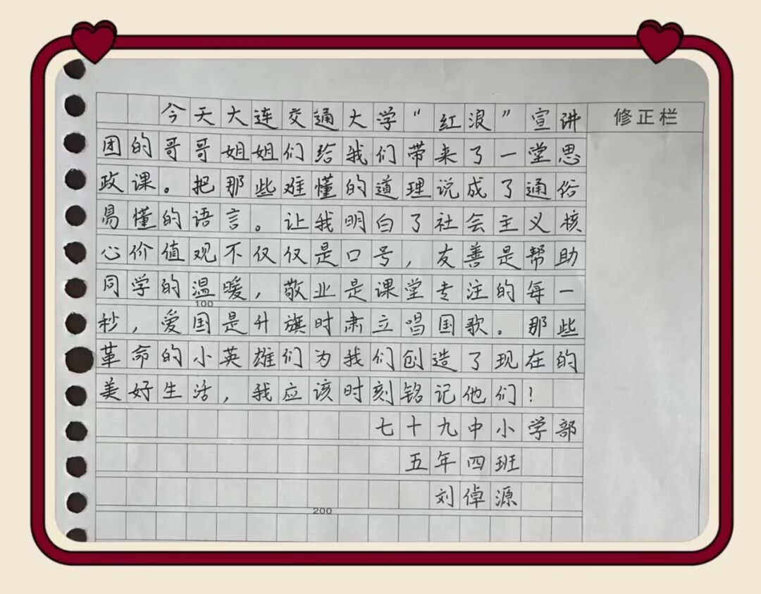“红浪”研究生宣讲团走进大连市第七十九中学小学部,开展“童心向党 筑梦成长”主题红色宣讲活动,用贴近孩童的鲜活讲述、温情互动,把爱国教育与少年梦想紧密相连,在孩子们稚嫩的心田播撒下爱党爱国、向阳成长的种子。
